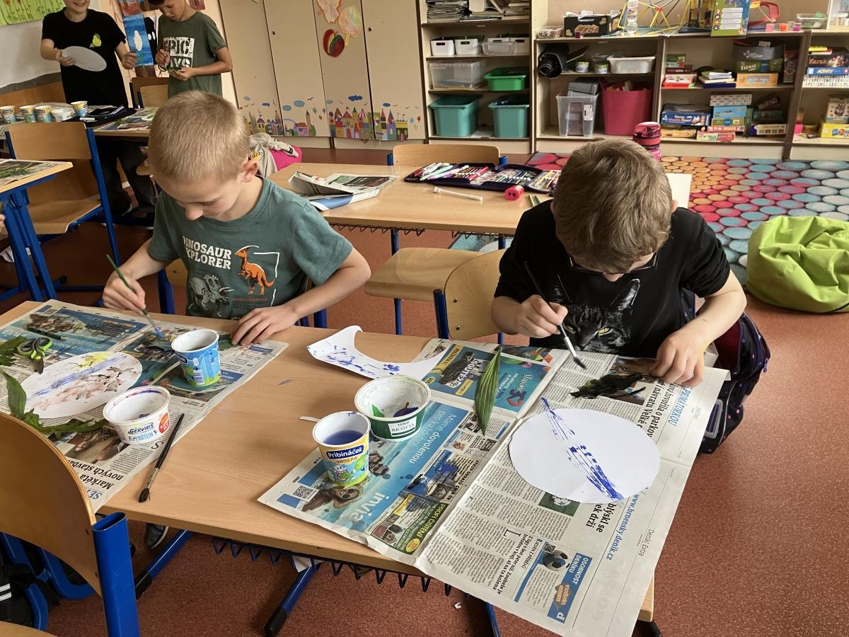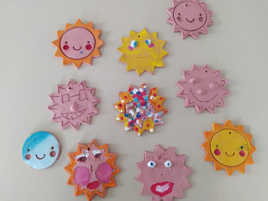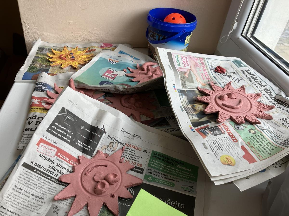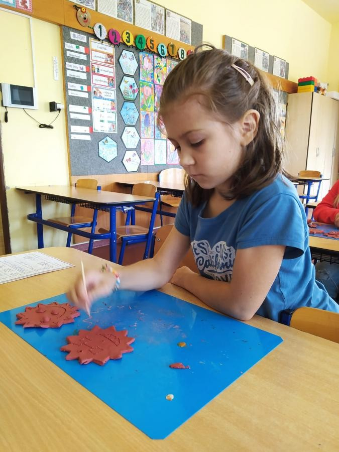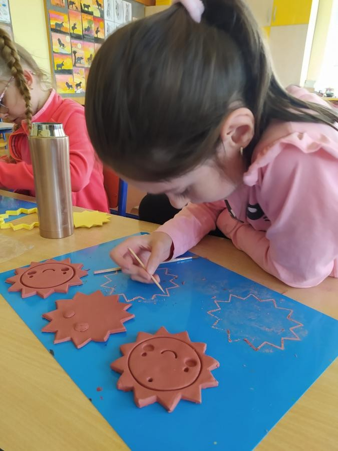 Novým tématem měsíce byl Den Slunce. Vyprávění o tom, proč je pro nás Slunce důležité, zhlédnuté video a povídání o celé Sluneční soustavě bylo završeno v 1. třídě výrobkem Sluneční soustavy. V ostatních třídách jsme si vymodelovali ze samotvrdnoucí hmoty sluníčka na zavěšení. Kdo chtěl, dokončil výzdobu ještě akrylovými barvami.