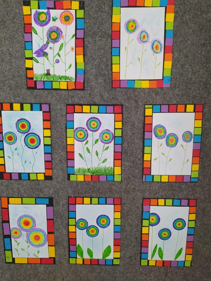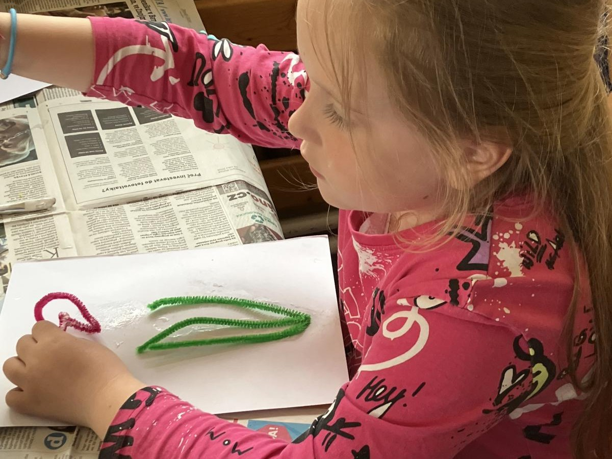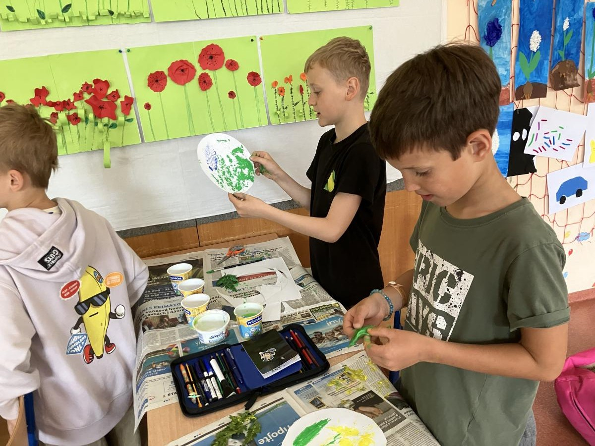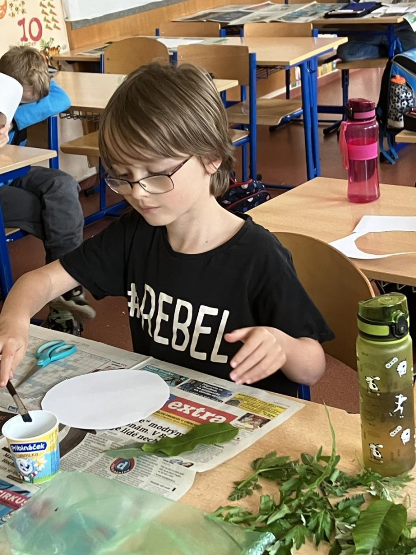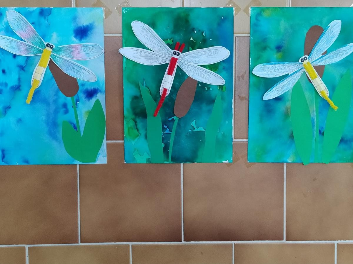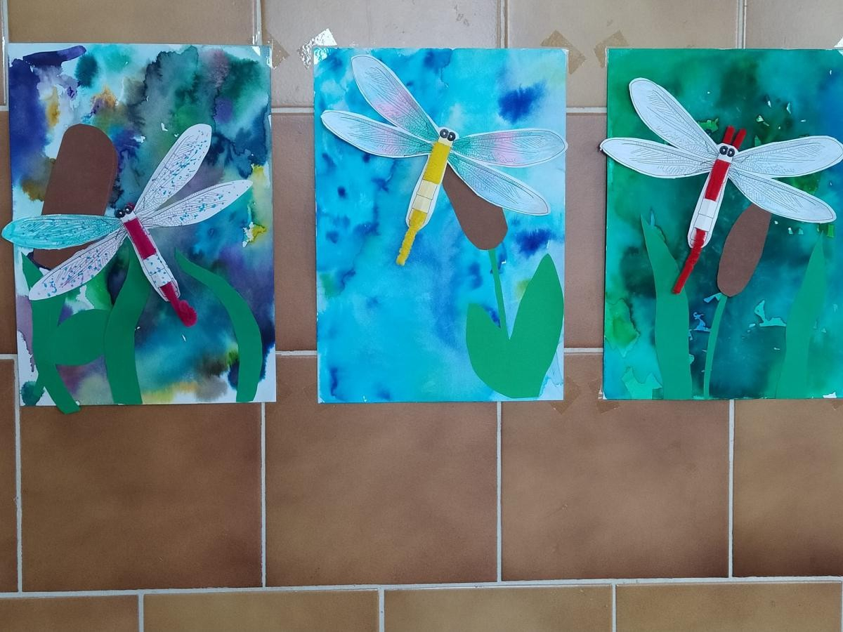 V závěru měsíce už jsme všichni cítili, že se těšíme na léto a teplo. A tak jsme si výtvarně léto alespoň přivolali. Obrázky vážek nad vodou nebo květin v barvách duhy nám ozdobily jídelnu. Děti bavilo i barvení listů různých rostlin a jejich otiskování na kruhový papír.