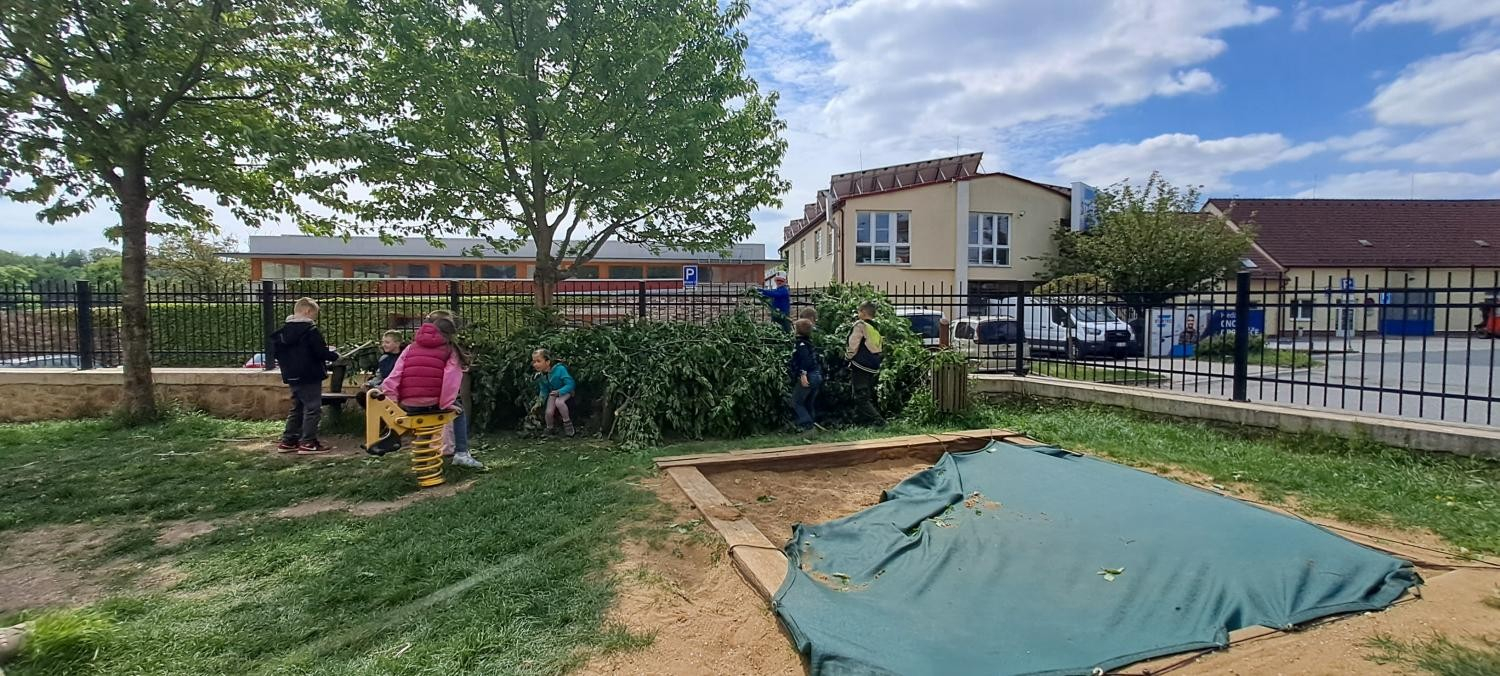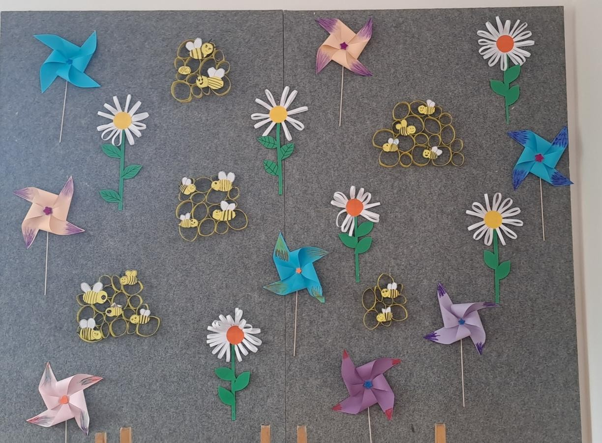 Vděčným tématem byl v měsíci květnu také Den včel. Děti se seznámily se životem včel a jejich užitečností pro přírodu a člověka. Vyrobily si včelí úl a poznávaly květiny a stromy, které pilné včelky opylují. Nakonec pro naši nástěnku v jídelně všichni vyrobili krásné květy sedmikrásek. A protože nám velmi často foukal vítr, přidali ke svým výrobkům i barevné větrníky.