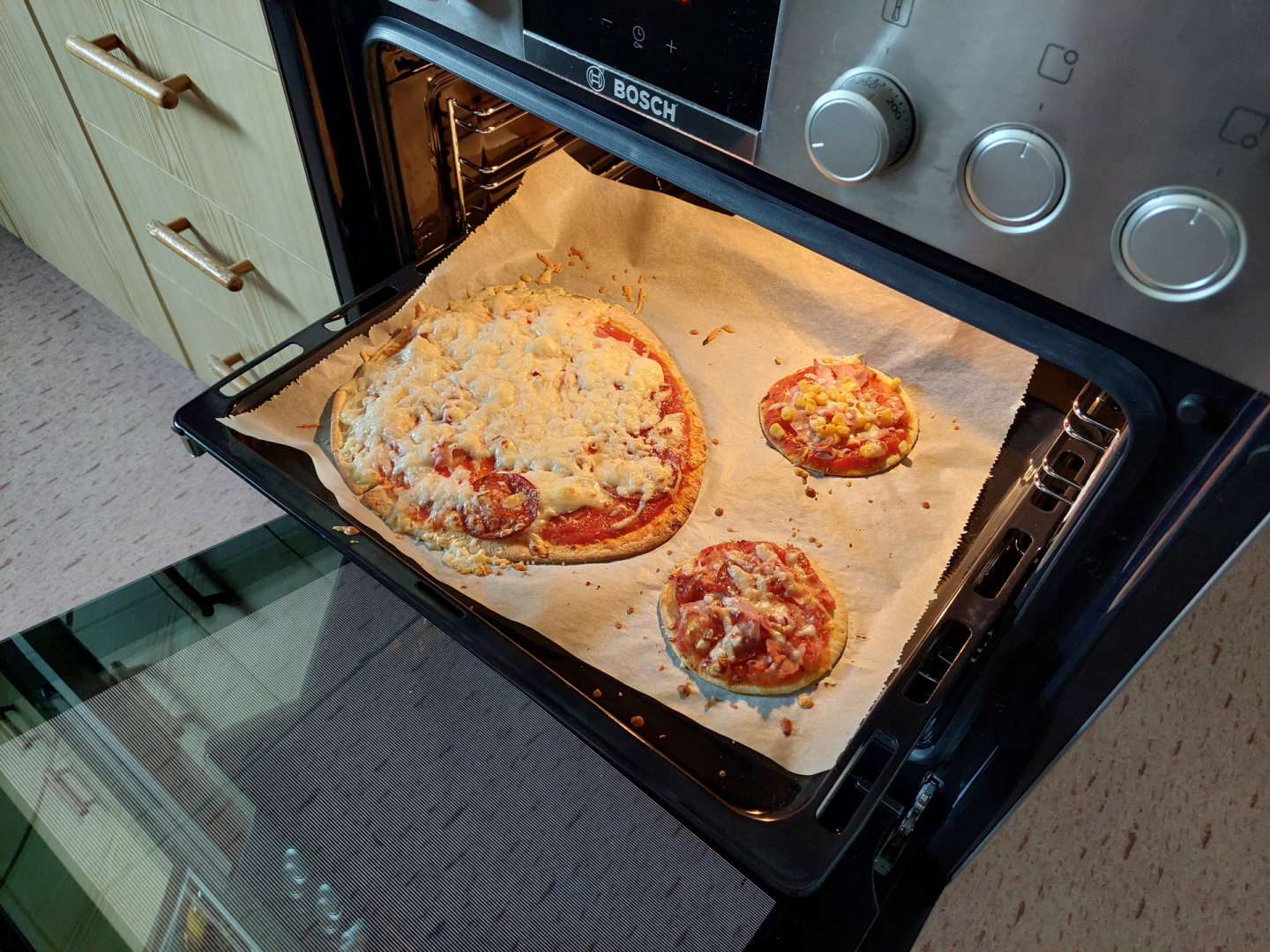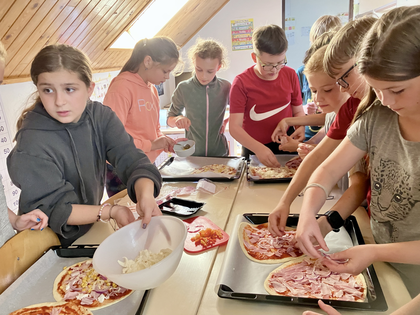 V naší školní kuchyňce si tak každý připravil svoji vlastní pizzu podle vlastní chuti. Vzniklo tak mnoho variant např. s kukuřící, se šunkou, se slaninou, s cibulí nebo se sýrem. Během této činnosti jsme hovořili v angličtině, a tak jsme jiným způsobem procvičovali další nová slovíčka a fráze.