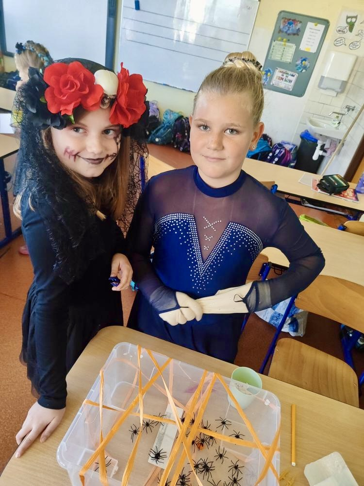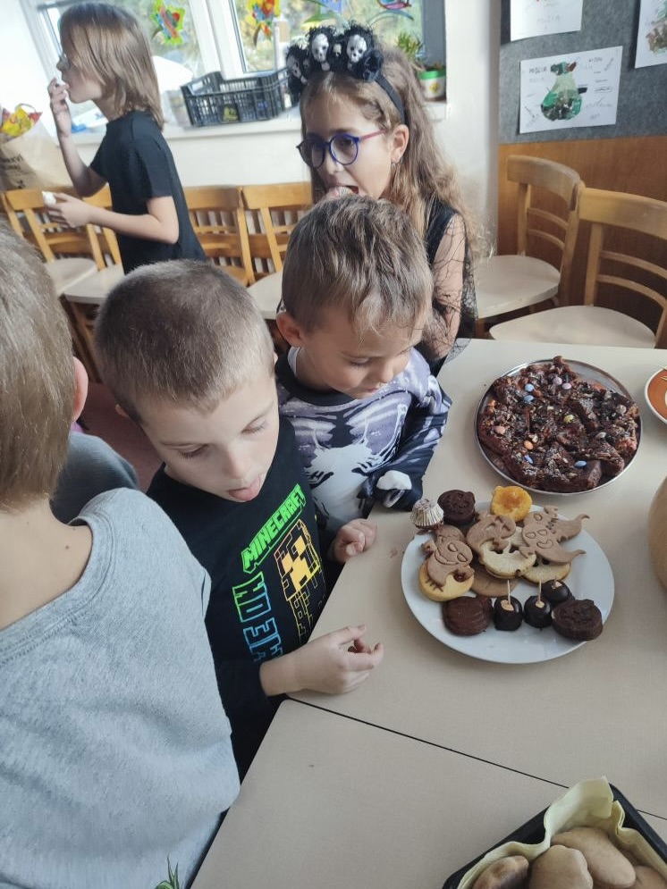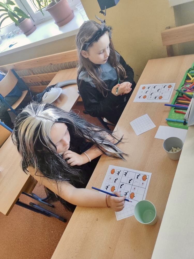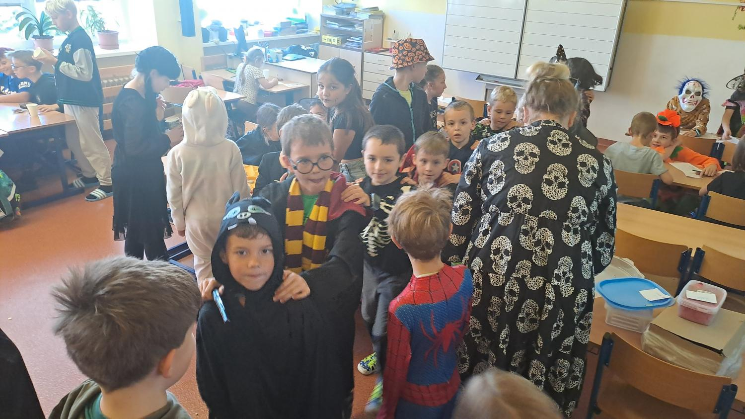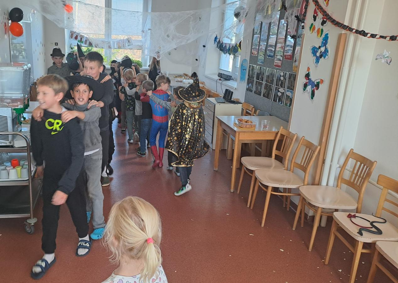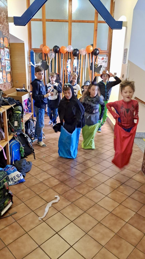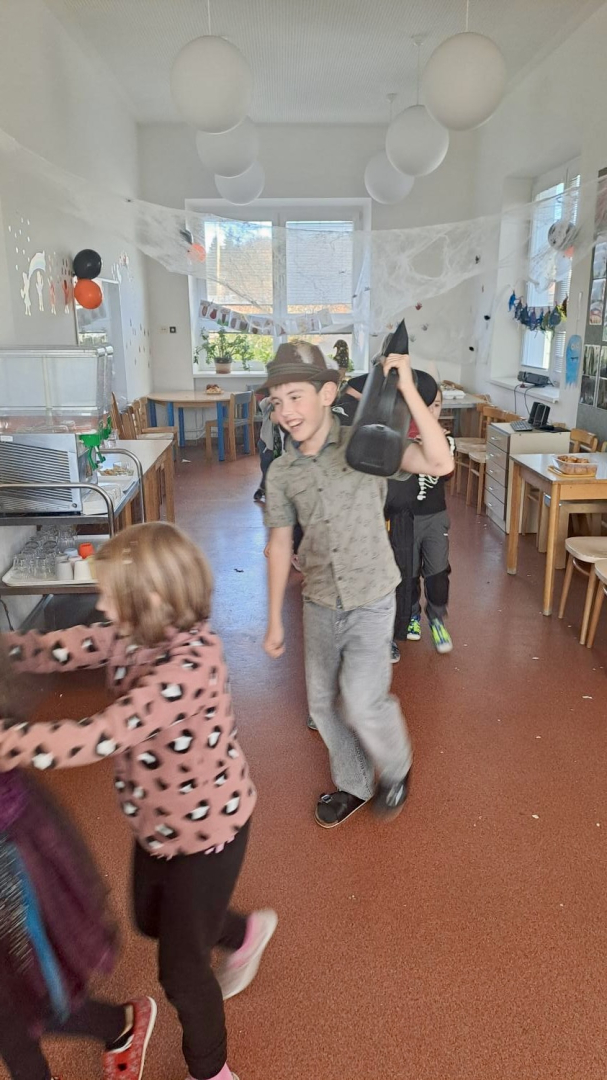 I ve školní družině jsme také oslavili Halloween! Žáci dorazili v krásných kostýmech a celé odpoledne se neslo ve znamení her, soutěží a dobré nálady. Na jednotlivých stanovištích je čekaly různé úkoly – házení do kruhu, skákání v pytli, luštění hlavolamů, lovení pavouků a jiné. S organizací soutěží nám ochotně pomáhali i nejstarší páťáci, kteří se svých rolí zhostili na jedničku. Za získané body si žáci mohli vybrat drobné odměny a sladkosti. Velké poděkování patří také rodičům, kteří připravili spoustu dobrot – vše mizelo během chvilky! Nechyběl ani popcorn a na závěr si všichni společně zatančili na dětské diskotéce, kde hrály i písničky na přání. Bylo to veselé, barevné a trochu strašidelné odpoledne, které si všichni moc užili!