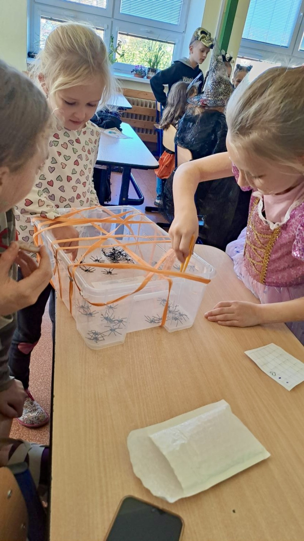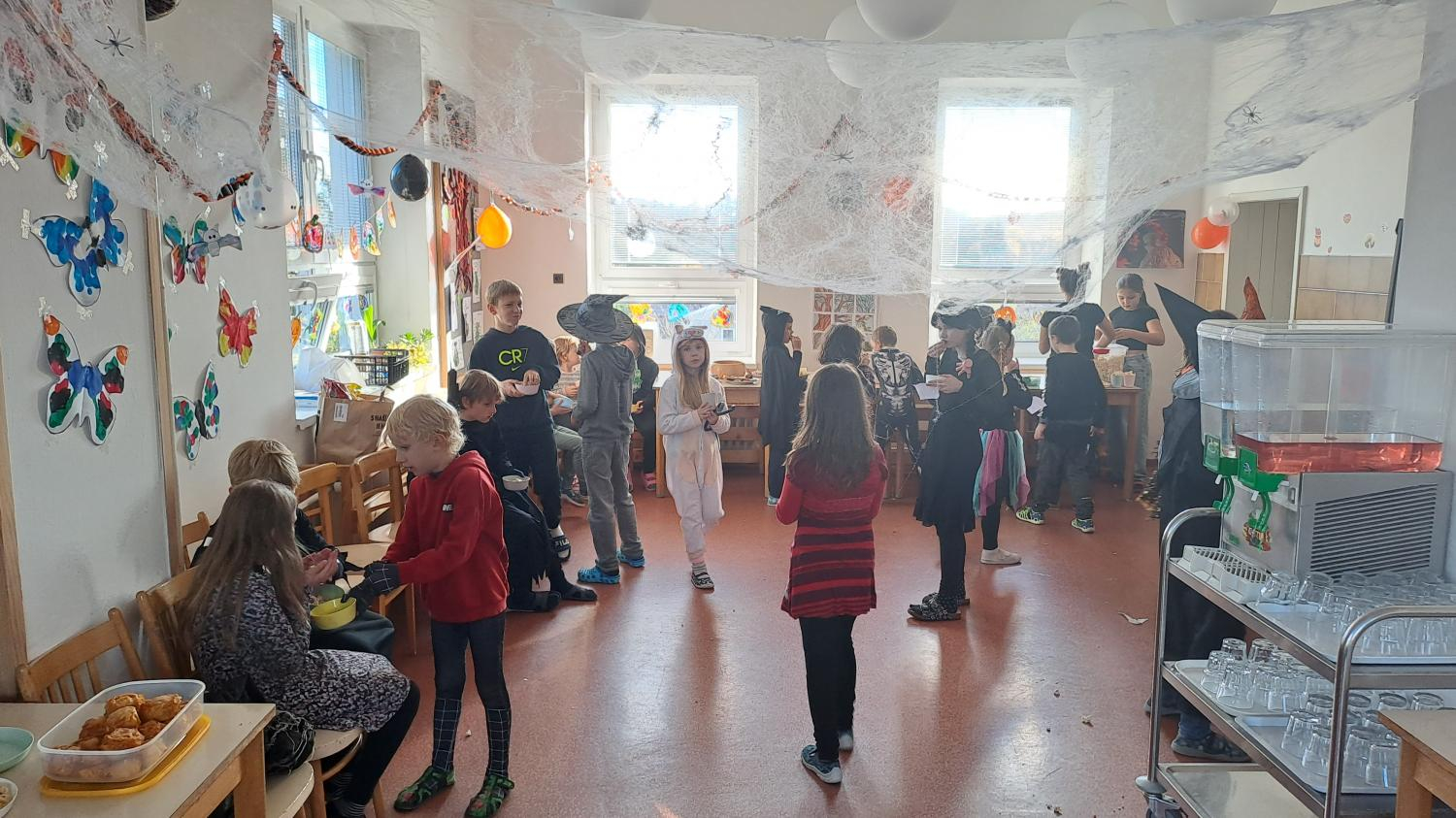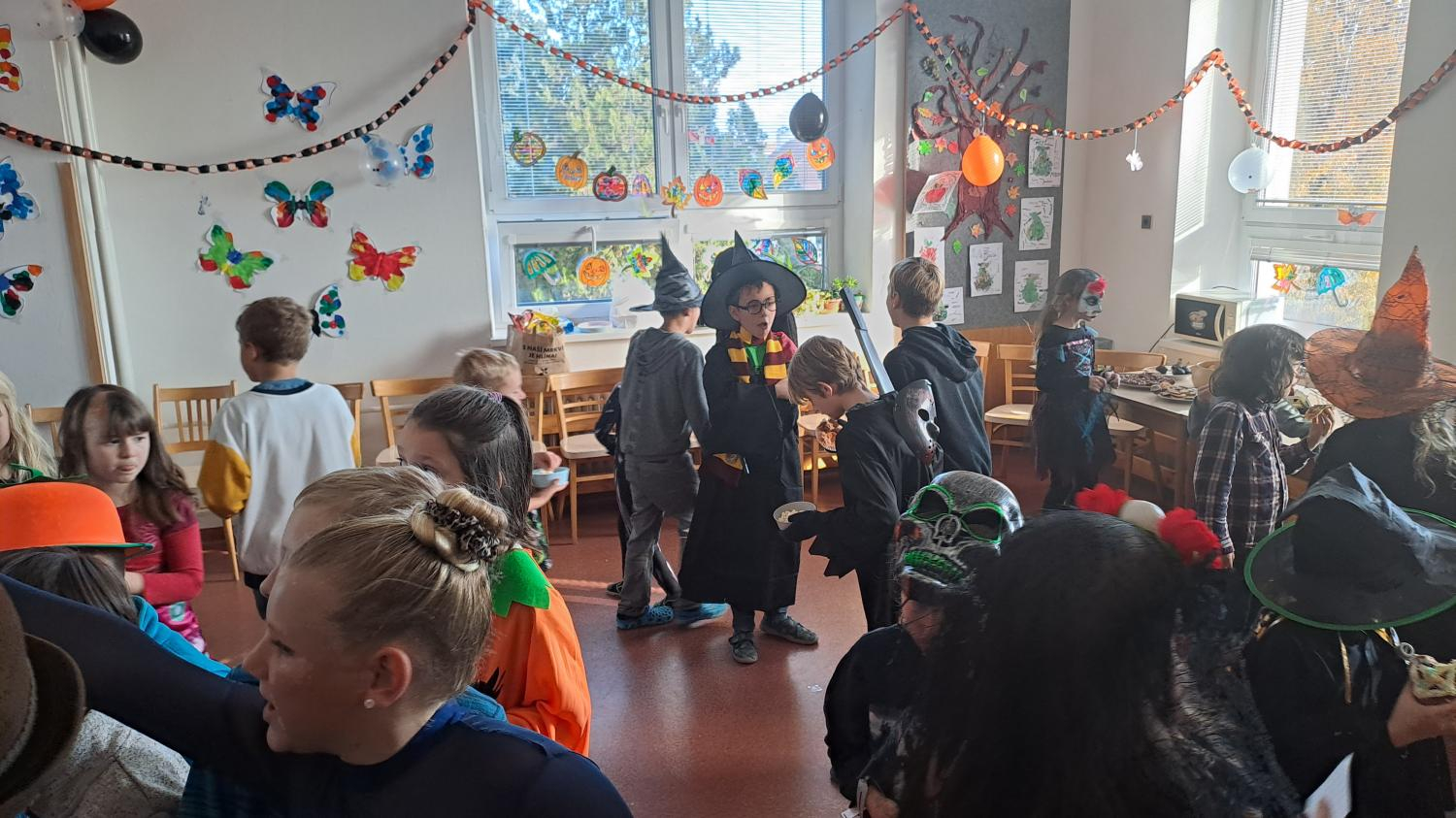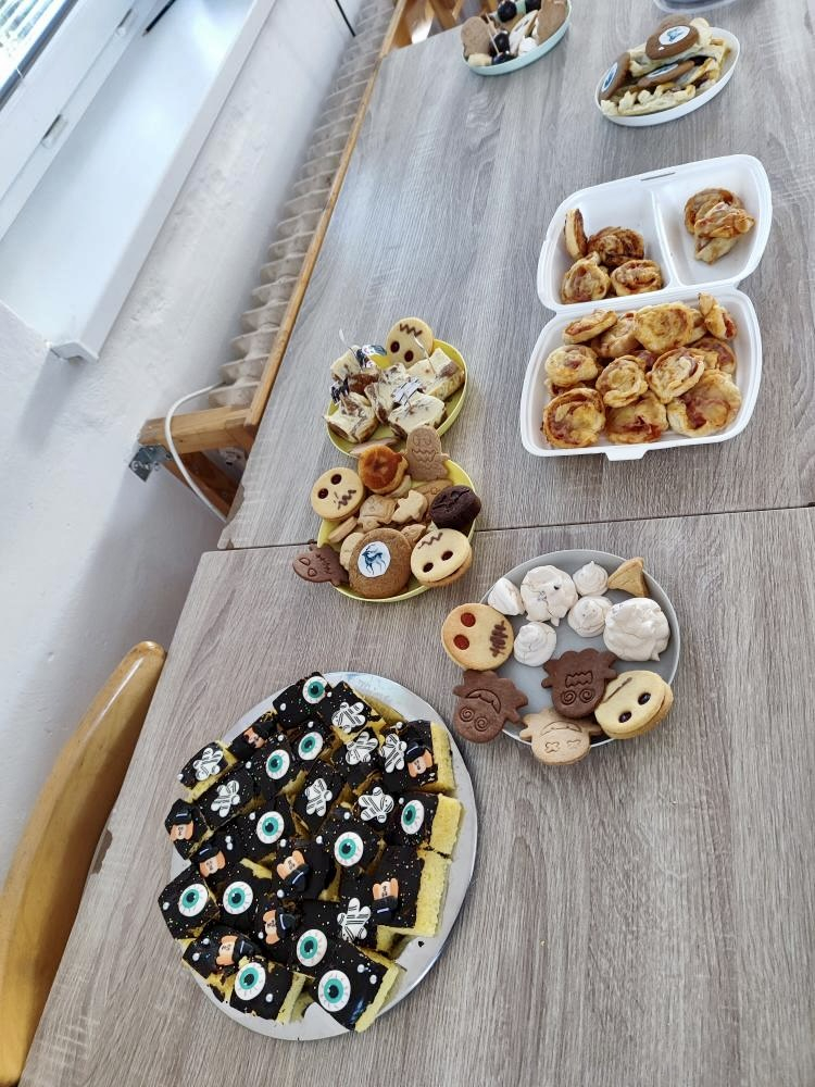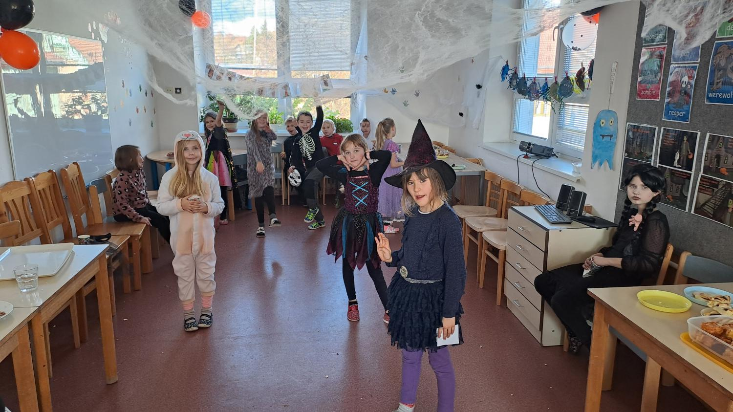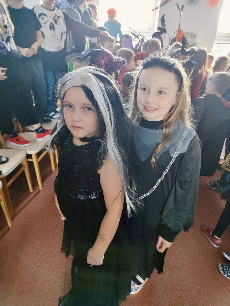 I ve školní družině jsme také oslavili Halloween! Žáci dorazili v krásných kostýmech a celé odpoledne se neslo ve znamení her, soutěží a dobré nálady. Na jednotlivých stanovištích je čekaly různé úkoly – házení do kruhu, skákání v pytli, luštění hlavolamů, lovení pavouků a jiné. S organizací soutěží nám ochotně pomáhali i nejstarší páťáci, kteří se svých rolí zhostili na jedničku. Za získané body si žáci mohli vybrat drobné odměny a sladkosti. Velké poděkování patří také rodičům, kteří připravili spoustu dobrot – vše mizelo během chvilky! Nechyběl ani popcorn a na závěr si všichni společně zatančili na dětské diskotéce, kde hrály i písničky na přání. Bylo to veselé, barevné a trochu strašidelné odpoledne, které si všichni moc užili!