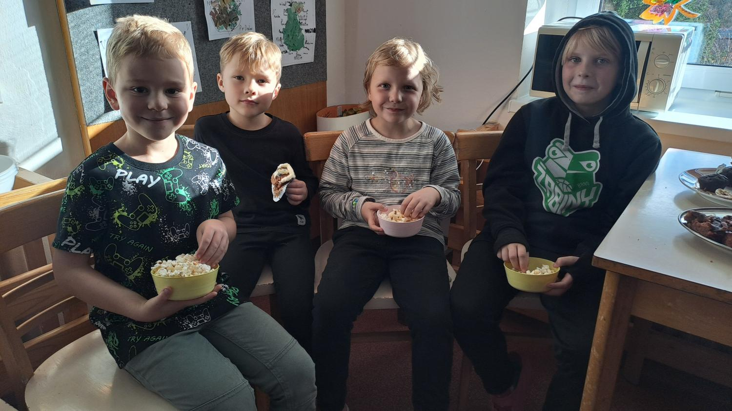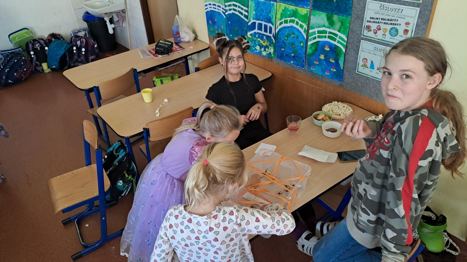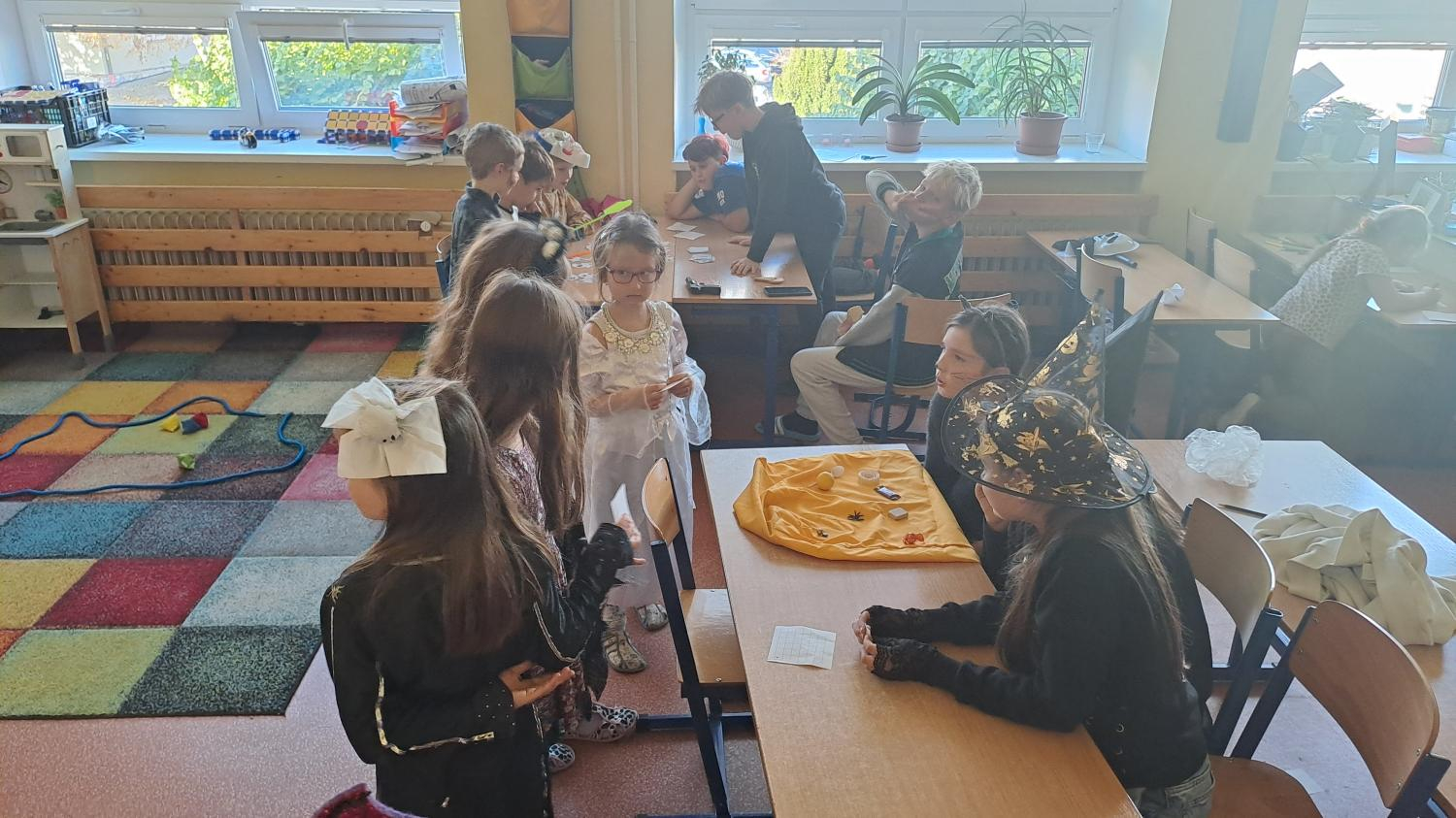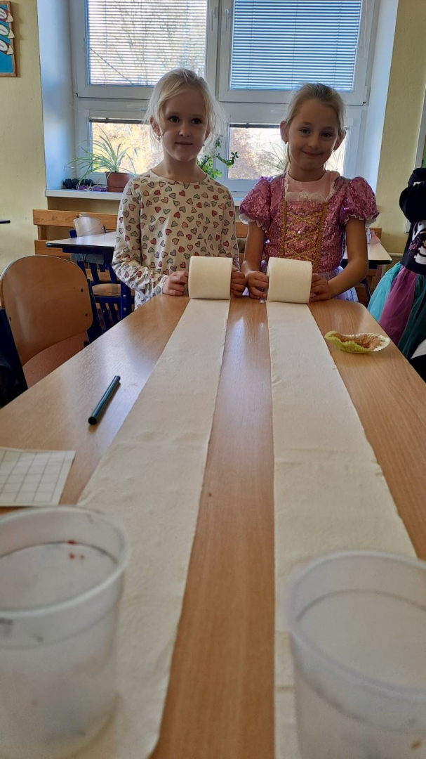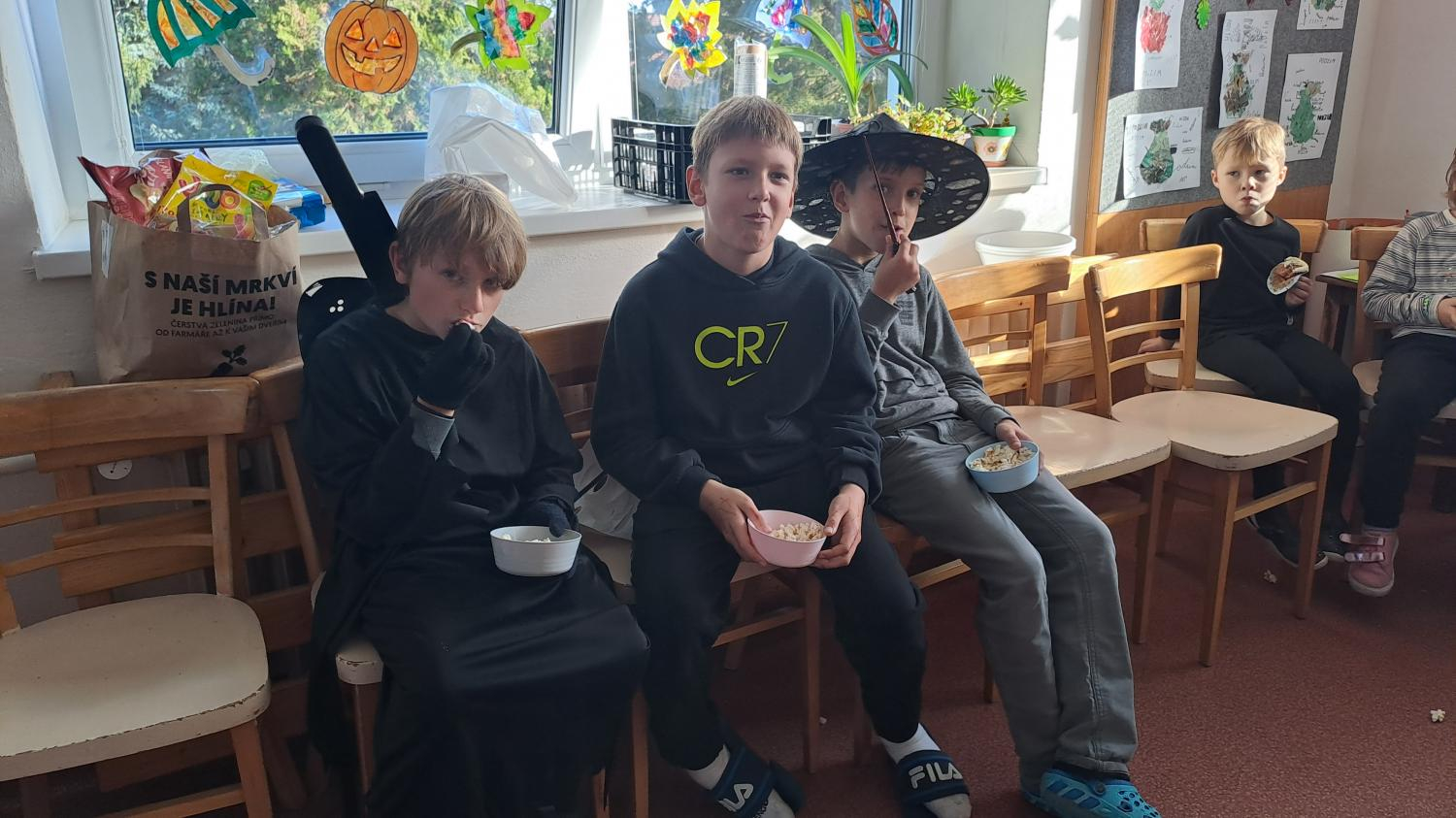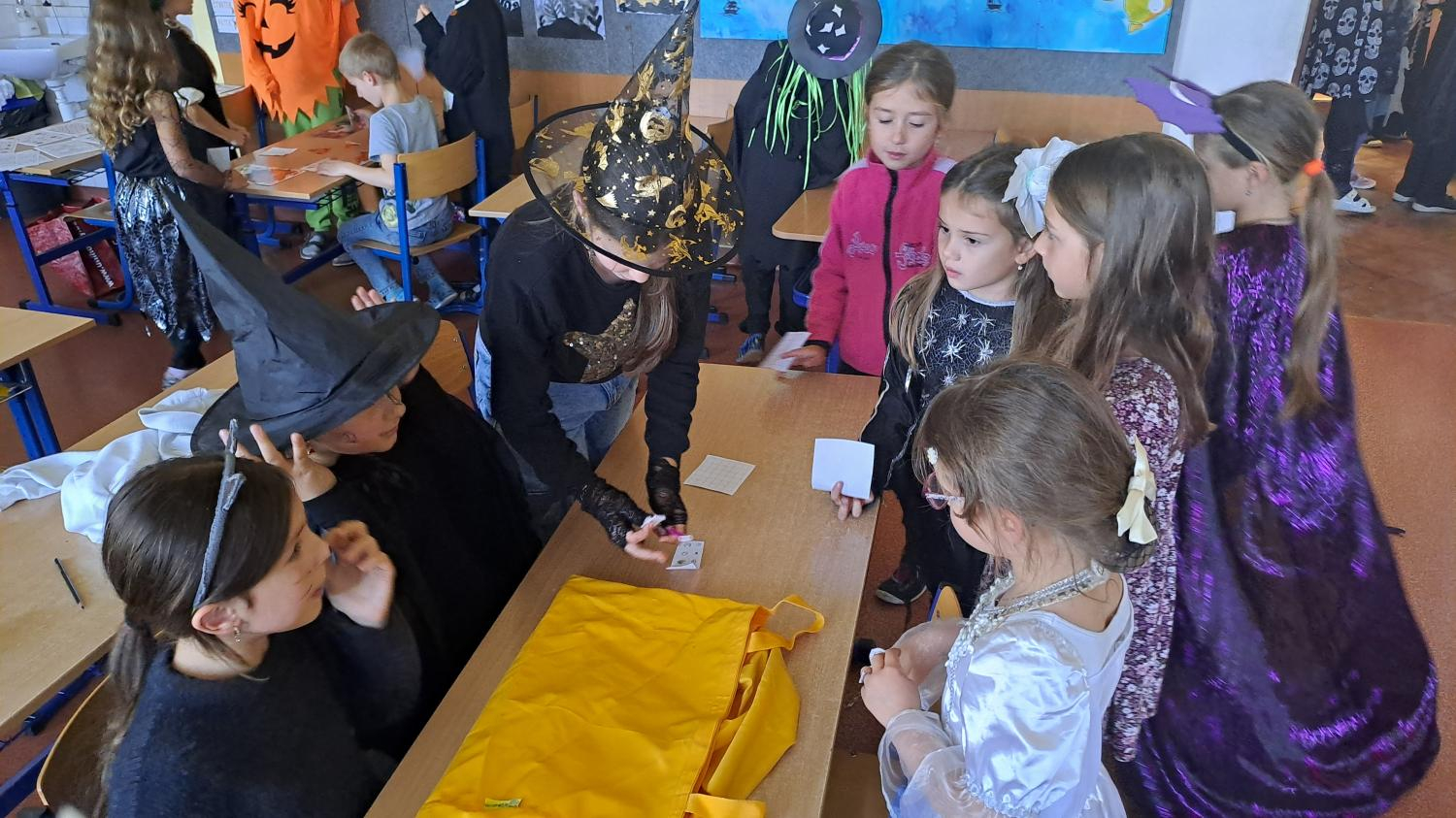 I ve školní družině jsme také oslavili Halloween! Žáci dorazili v krásných kostýmech a celé odpoledne se neslo ve znamení her, soutěží a dobré nálady. Na jednotlivých stanovištích je čekaly různé úkoly – házení do kruhu, skákání v pytli, luštění hlavolamů, lovení pavouků a jiné. S organizací soutěží nám ochotně pomáhali i nejstarší páťáci, kteří se svých rolí zhostili na jedničku. Za získané body si žáci mohli vybrat drobné odměny a sladkosti. Velké poděkování patří také rodičům, kteří připravili spoustu dobrot – vše mizelo během chvilky! Nechyběl ani popcorn a na závěr si všichni společně zatančili na dětské diskotéce, kde hrály i písničky na přání. Bylo to veselé, barevné a trochu strašidelné odpoledne, které si všichni moc užili!