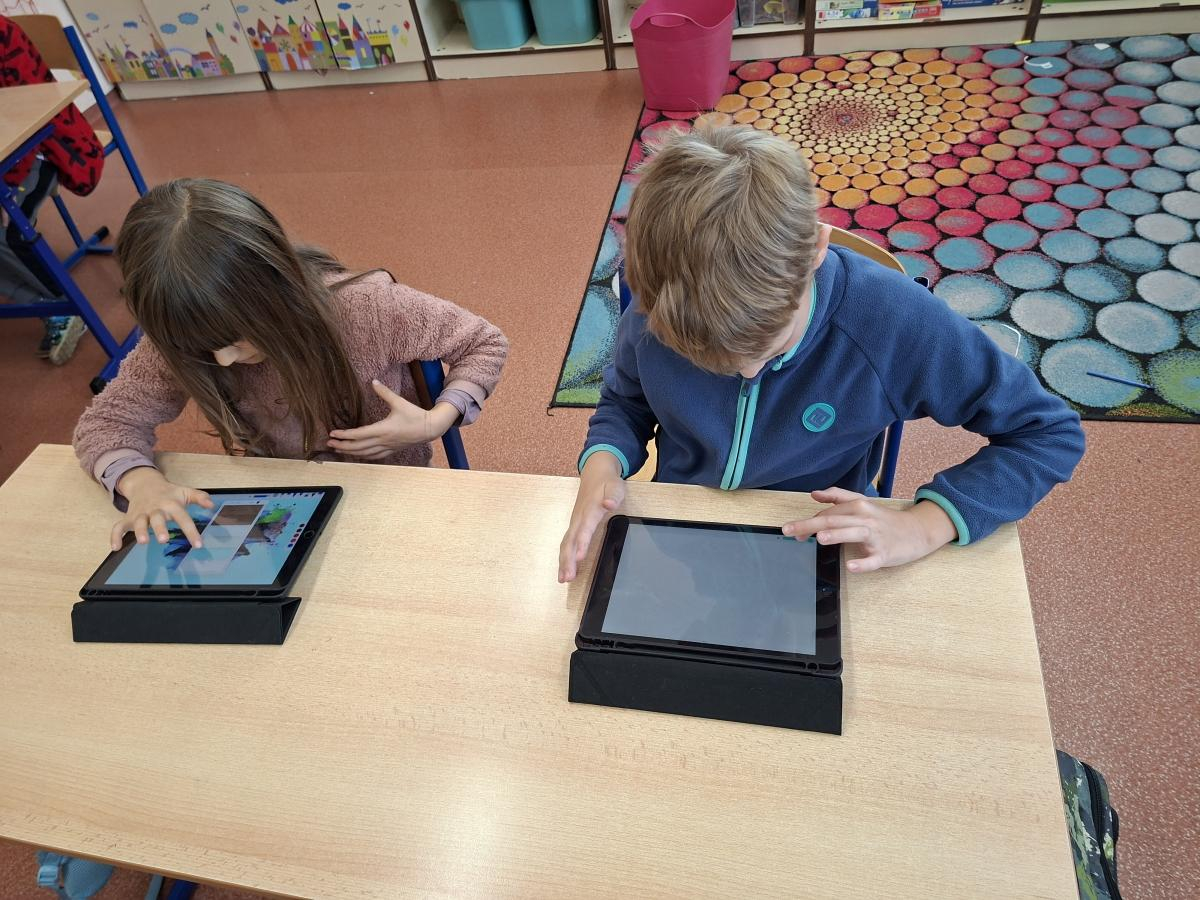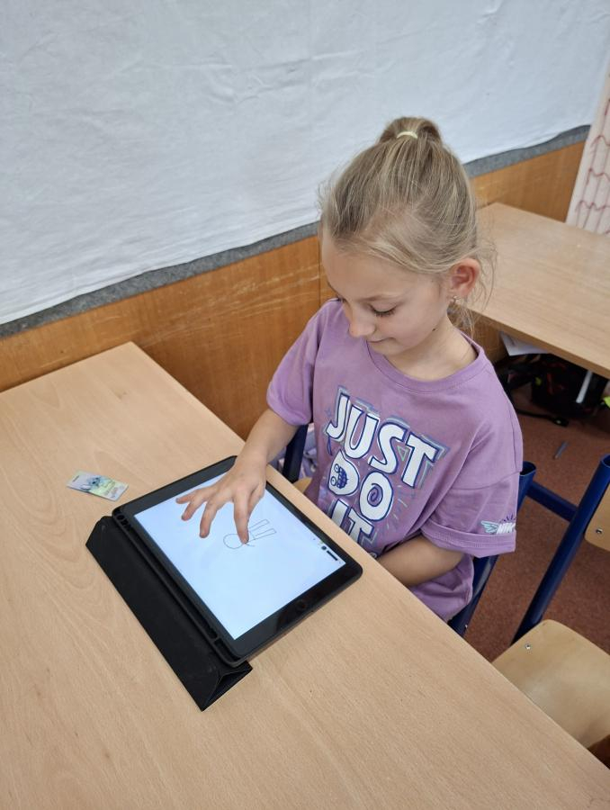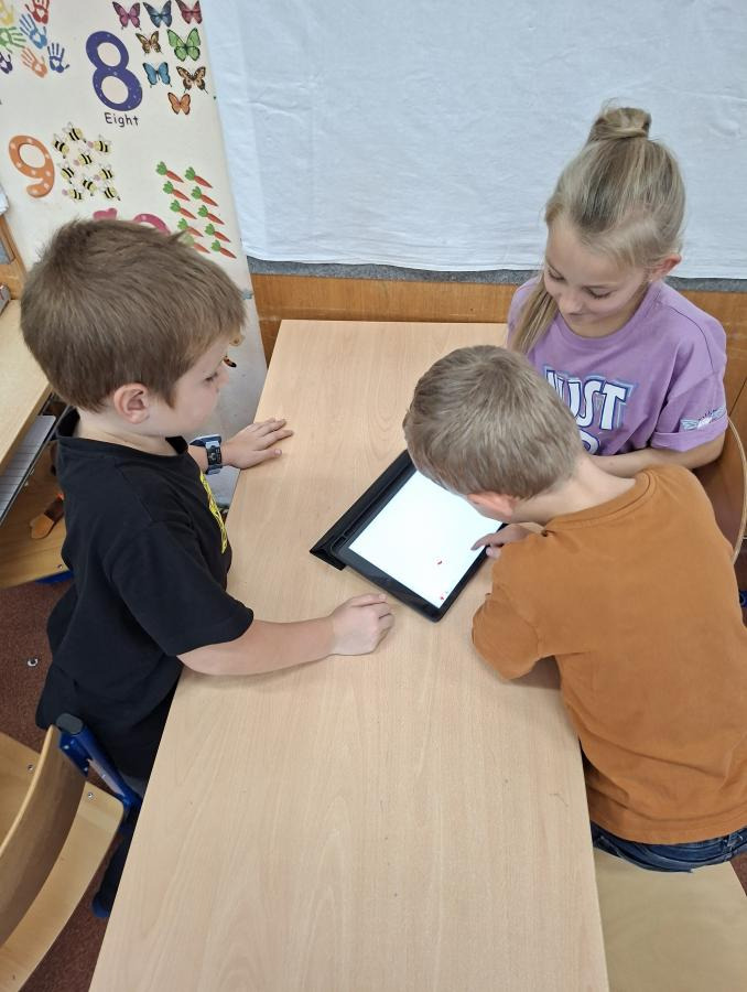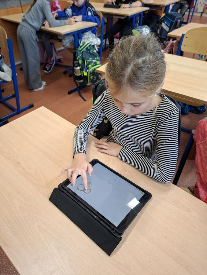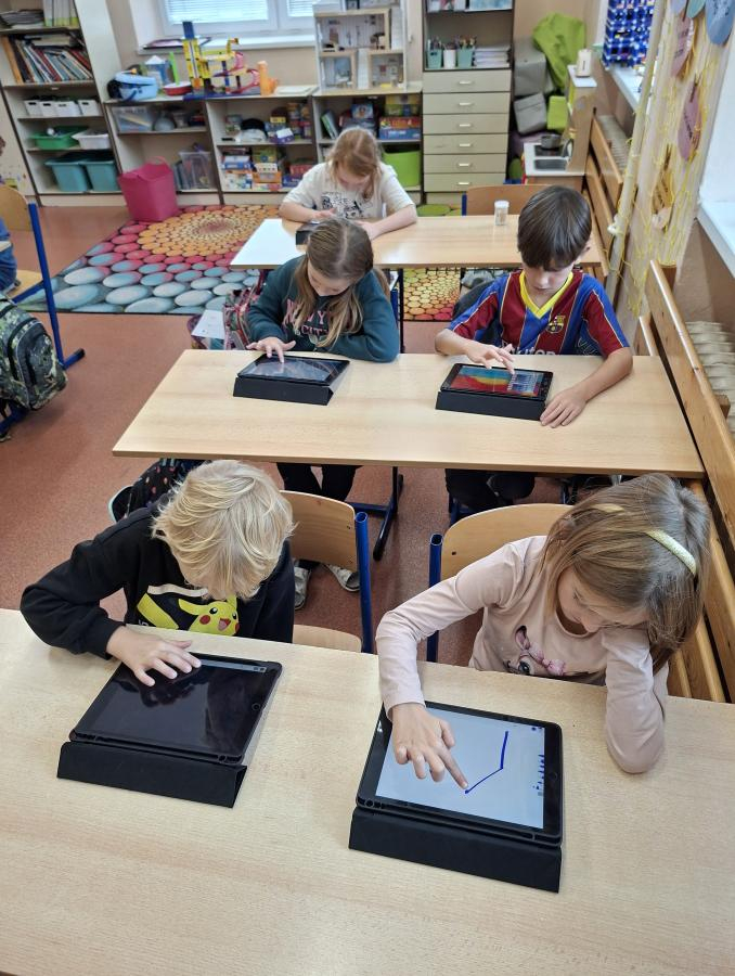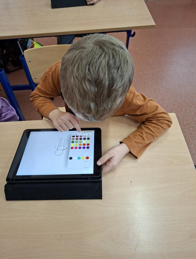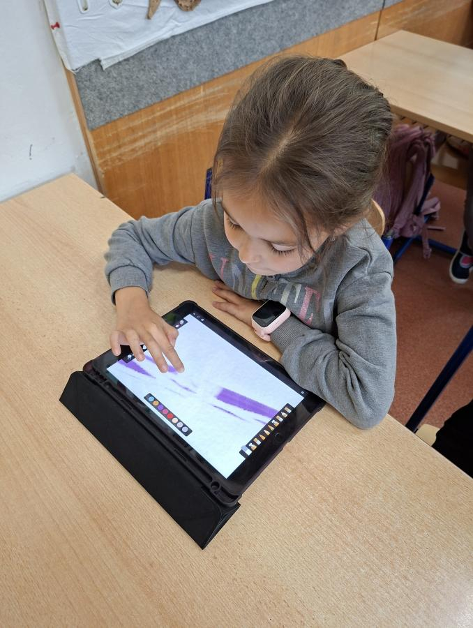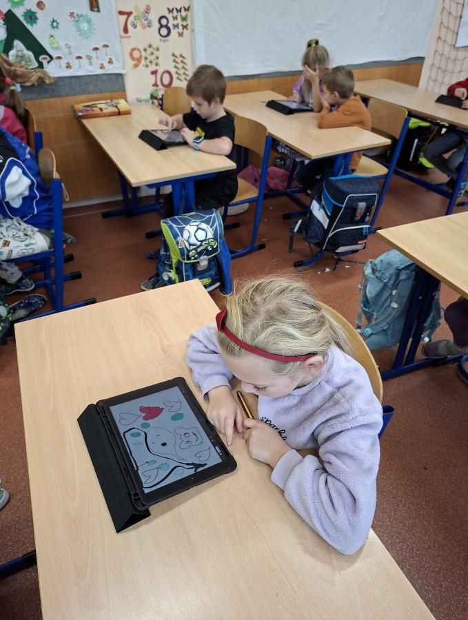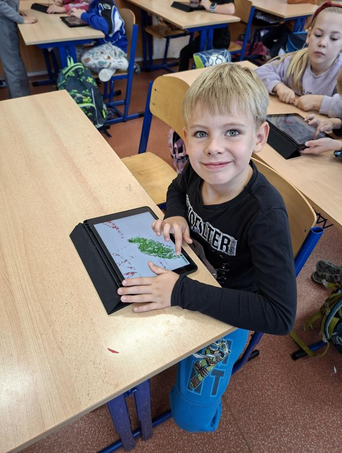 Také naši druháci se dočkali interaktivní výuky a práce s iPady. Po krátké instruktáži, jak s iPadem pracovat, ověřit nastavení a otevřít aplikaci, mohli začít pracovat. Zadané obrázky se jim dařilo nakreslit a zvolit i další grafické obrazce, které vyplnili barvou. Pro všechny ročníky bude i nadále interaktivní výuka průběžně zařazována.