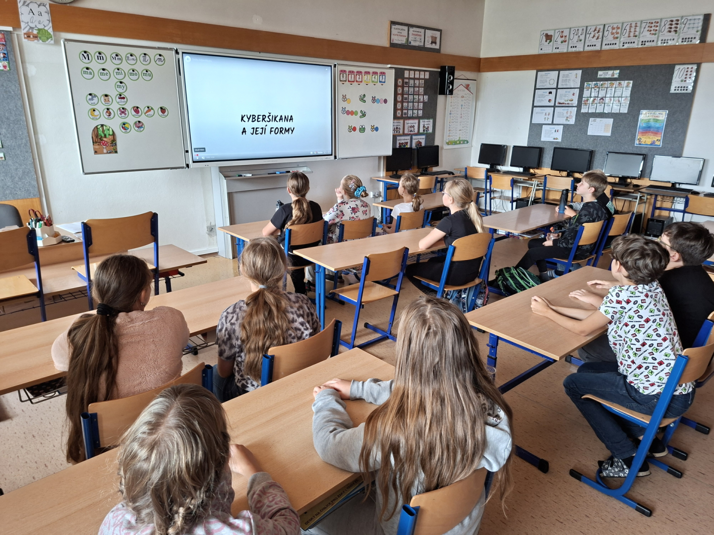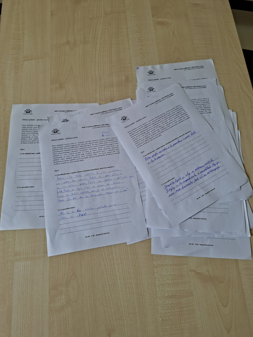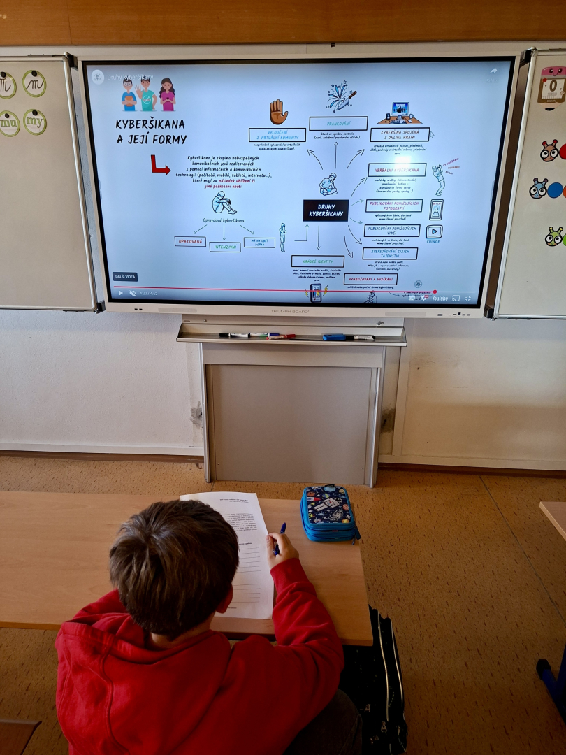 V rámci primární prevence jsme pro žáky 5. ročníku připravili v hodinách informatiky téma kyberšikany, kdy jsme se věnovali případům, které poukazovaly na rizikové chování na internetu a nebezpečí na sociálních sítích. Žáci byli seznámeni s problematikou útoků pomocí elektronických médií a trestní odpovědnosti jako následek tohoto nesmyslného jednání. V závěru měl poté každý za úkol zpracovat téma, odpovědět na otázky v pracovním listu a díky tomu si tak uvědomit případy a situace, které by se mohly žáků nebo jejich okolí v budoucnu týkat.
