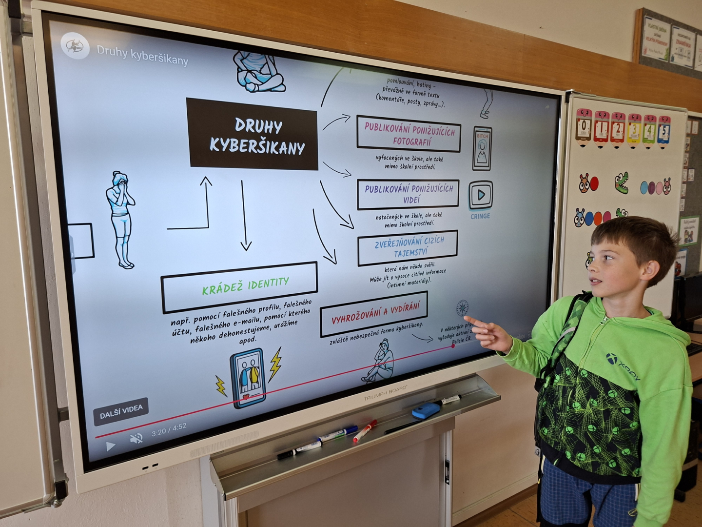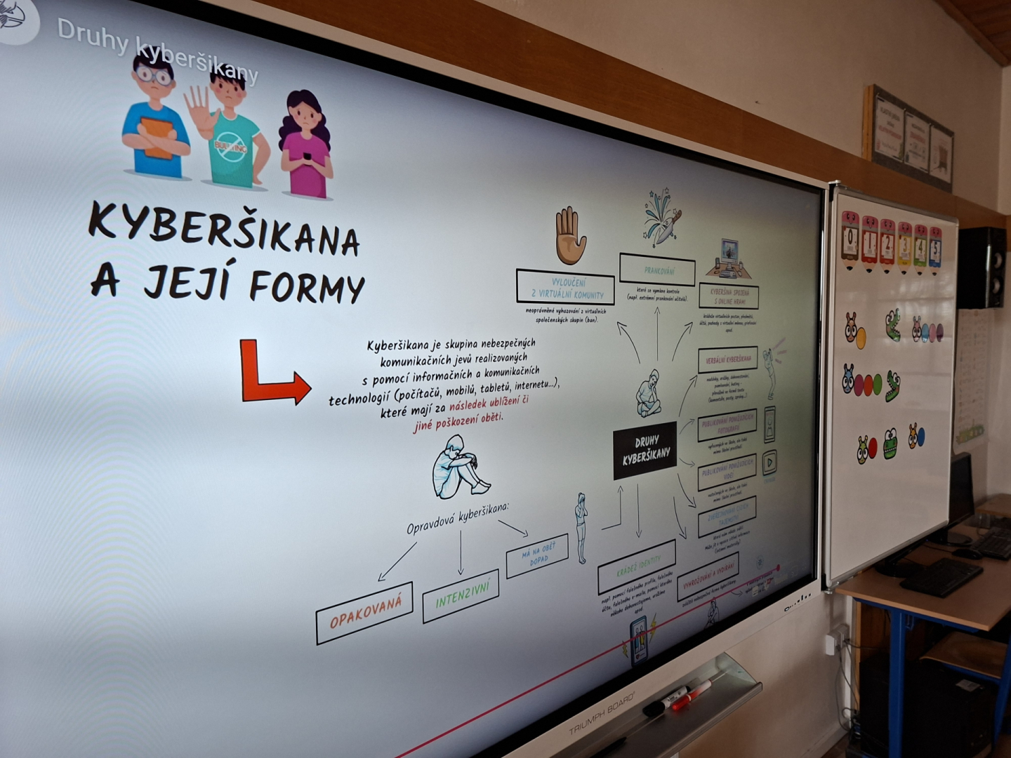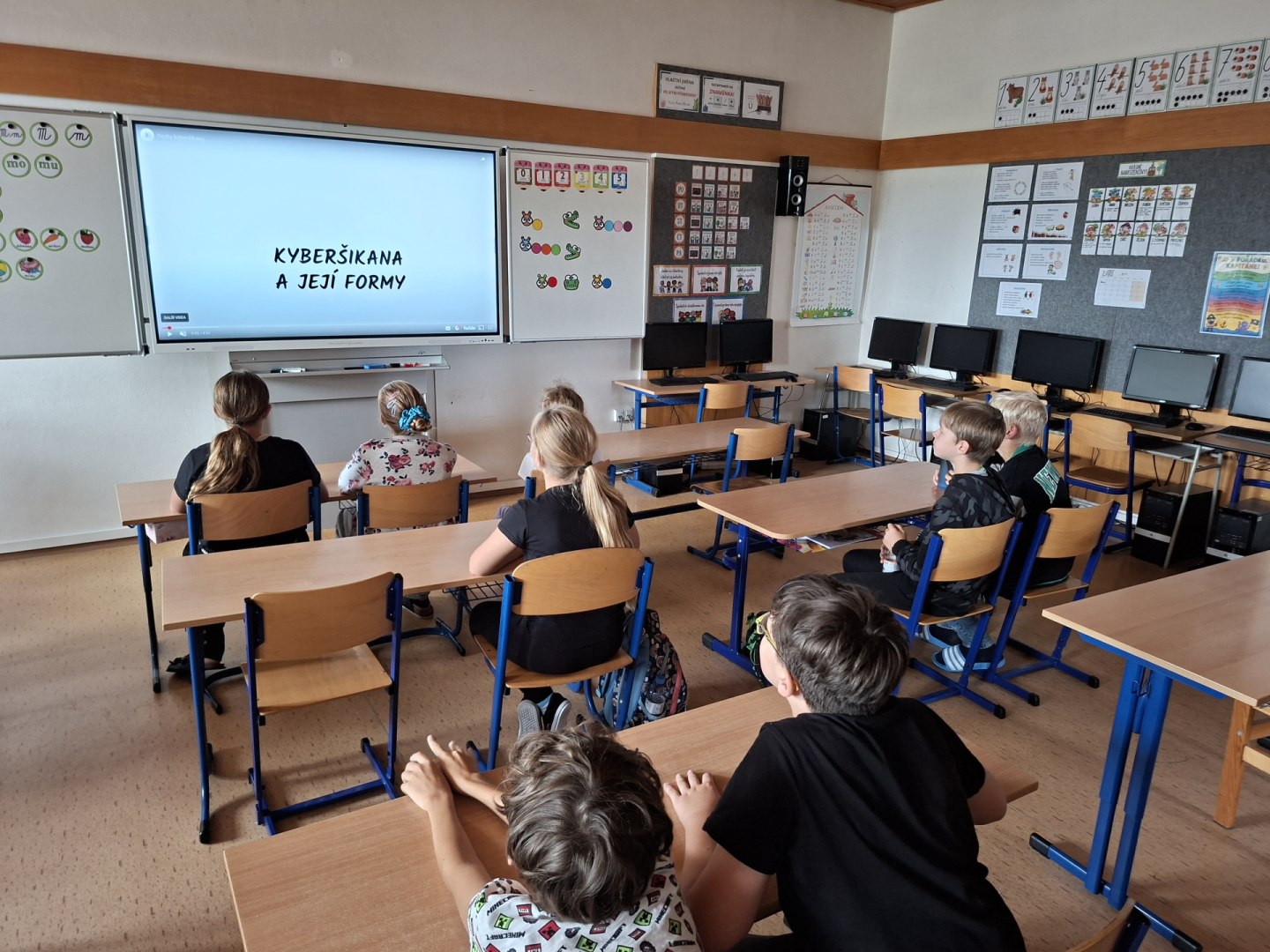 V rámci primární prevence jsme pro žáky 5. ročníku připravili v hodinách informatiky téma kyberšikany, kdy jsme se věnovali případům, které poukazovaly na rizikové chování na internetu a nebezpečí na sociálních sítích. Žáci byli seznámeni s problematikou útoků pomocí elektronických médií a trestní odpovědnosti jako následek tohoto nesmyslného jednání. V závěru měl poté každý za úkol zpracovat téma, odpovědět na otázky v pracovním listu a díky tomu si tak uvědomit případy a situace, které by se mohly žáků nebo jejich okolí v budoucnu týkat.